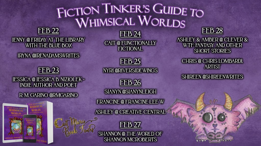 We’re starting now with Fiction Tinker’s Guide to Whimsical Worlds written by award-winning author Theodore Niretac Tinker and illustrated by Holla Watson!